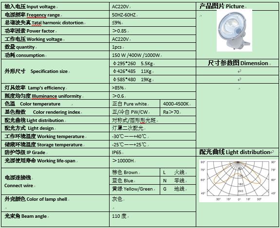 2、光效节能:选用高效气体放电光源,节能、寿命长。灯泡使用寿命高达15000小时以上。特别适合户外大面积无人看守照明。